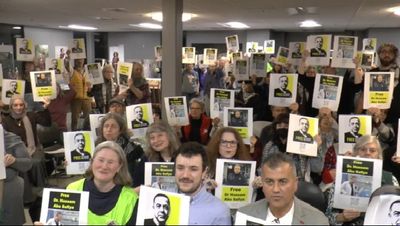 The Palestine Museum US was filled to the brim for the tribute to abducted Dr. Abu Safiya. At the end of the ceremony everyone in the hall held up pictures of Dr. Abu Safiya and chanted. Here's a "short of it.